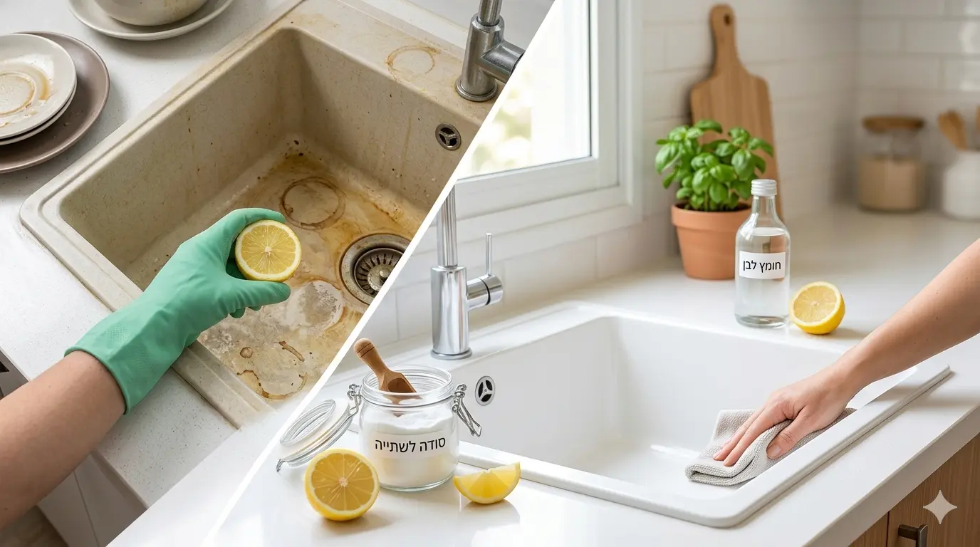 חשוב לדעת: רוב הכיורים המודרניים (כמו סיליקוורץ או גרניט) הם בעלי נקבוביות זעירות. שימוש בחומרים חריפים מדי אולי ילבין את הכיור לרגע, אבל יפתח את הנקבוביות ויגרום לו להצהיב מהר יותר בעתיד.